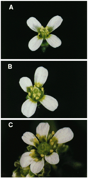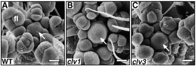 La production réussie d’organes floraux (nombre approprié d’organes floraux disposés dans des positions normales) nécessite un maintien et une régulation stricts du méristème floral. Aux stades 1 à 2 du développement floral, le méristème floral utilise des mécanismes de régulation similaires à ceux du MAC. Les gènes affectant la taille du MAC affectent généralement la taille du méristème floral. Les mutants clv1 présentent des méristèmes floraux élargis, entraînant une augmentation du nombre d’organes dans les quatre verticilles floraux et même des verticilles supplémentaires (Clark et al., 1993).