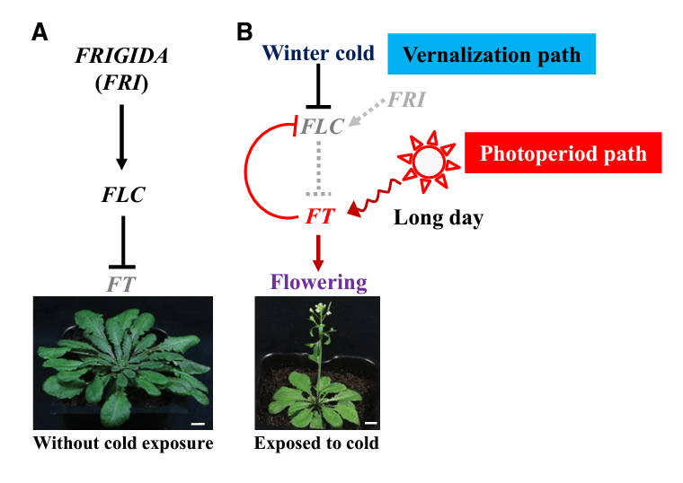 La vernalisation doit renverser l’activation de l’expression de FLC (Li et al., 2018). En effet, FLC réprime directement l’expression de FT et de SOC1 qui sont nécessaires à la transition florale (Helliwell et al., 2006).