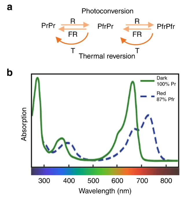 Comment est perçue la lumière (et donc la photopériode) dans les feuilles ? La perception de la lumière dépend en partie des phytochromes. Ce sont des chromoprotéines absorbant la lumière rouge claire/rouge sombre avec un chromophore lié par covalence (Franklin et Quail, 2010). PhyA et phyB sont les membres les plus abondants et les plus importants de la famille. Dans l’obscurité, les phytochromes sont présents sous la forme inactive absorbant la lumière rouge clair (Pr), qui est convertie lors d’une illumination à la lumière rouge clair en conformère actif absorbant la lumière rouge sombre ou rouge lointain (Pfr avec fr pour far-red). La forme Pfr est rapidement reconvertie en forme Pr en absorbant la lumière rouge sombre (photoconversion) ou par un processus plus lent et indépendant de la lumière appelé réversion sombre et dépendant de la température (Rockwell et al., 2006). La phosphorylation de phyB sur la sérine 86 accélère la réversion sombre du récepteur (Medzihradszky et al., 2013).