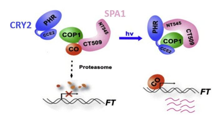 Les cryptochromes CRY1 et CRY2 interagissent avec SPA1 d’une manière dépendante de la lumière bleue, ce qui entraîne l’inhibition de l’activité COP1 et l’accumulation de la protéine CO le soir des longues journées (Lian et al., 2011 ; Zuo et al., 2011).