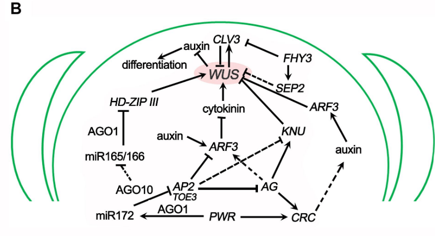 De manière intégrée, le MAC peut répondre à des signaux en provenance d’autres régions de la plante. Par exemple, l’expression de WUS est stimulée par les cytokinines dont les précurseurs sont produits par les racines puis transportés dans les parties aériennes par le xylème (Gordon et al., 2009; Osugi et al., 2017). Cela permet de coordonner la croissance de l’appareil aérien avec la croissance de l’appareil racinaire.