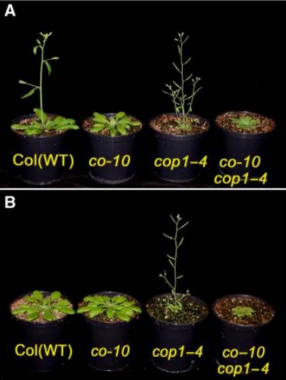 La régulation de l’horloge circadienne de la transcription de CO et la régulation de sa stabilité protéique par les photorécepteurs limitent l’activité du CO à une fenêtre en fin d’après-midi. Cela permet au CO de favoriser la floraison en activant directement l’expression du gène florigène FLOWERING LOCUS T (FT) spécifiquement dans l’après-midi/la soirée de longue journée (LD) (An et al., 2004). Bien que les transcrits de CO soient exprimés à des niveaux élevés de l’après-midi au petit matin suivant sous les jours courts (SD) et les LD, la protéine CO ne s’accumule que dans l’après-midi des LD. La déstabilisation de la protéine CO par ubiquitinylation dans la période d’obscurité est due à l’activité du complexe CONSTITUTIVELY PHOTOMORPHOGENEC 1 (COP1)-SUPPRESSOR of PHYA-105 (SPA), qui empêche la floraison sous SD (Jang et al., 2008, Liu et al., 2008).