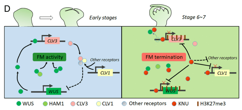 Après le stade floral 3, le mécanisme moléculaire régulant le méristème floral devient différent de celui du MAC. Au cours du stade floral 3 à 6, WUS favorise l’expression d’AGAMOUS (AG), spécifique des pièces fertiles de la fleur (Lenhard et al., 2001; Lohmann et al., 2001). Avec le développement floral, AG et le complexe répressif polycomb 1 (PRC1) commencent ensemble à inhiber l’expression de WUS (Liu et al., 2011). En parallèle, AG commence à induire progressivement l’expression de KNUCKLES (KNU), un répresseur à doigts de zinc de type C2H2 qui recrute davantage PRC2 pour inhiber l’expression de WUS (Sun et al., 2019).