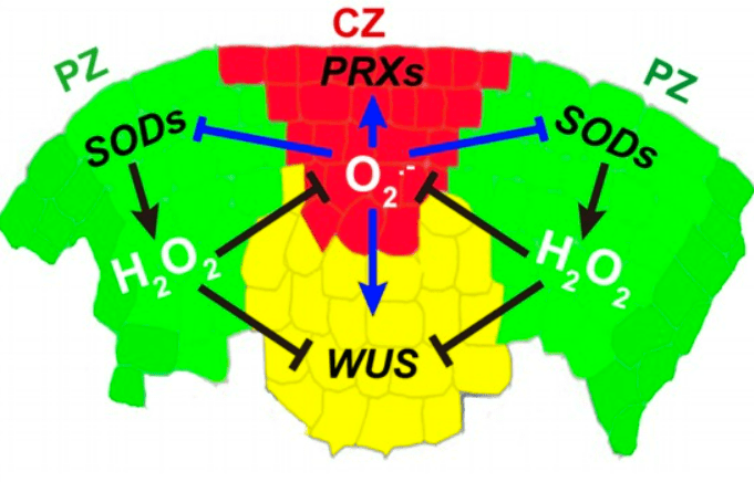 De manière intéressante, les espèces réactives de l’oxygène ont été impliqués récemment dans la régulation des cellules souches du MAC avec les ions superoxides O2.- qui s’accumulent dans les cellules souches et H202 (eau oxygénée) qui au contraire s’accumule dans les cellules qui sortent de l’état de cellules souches et qui vont se différencier grâce à l’expression de superoxide dismutases (SOD). O2.- et H202 influencent de manière opposée l’expression de WUS dans le centre organisateur.