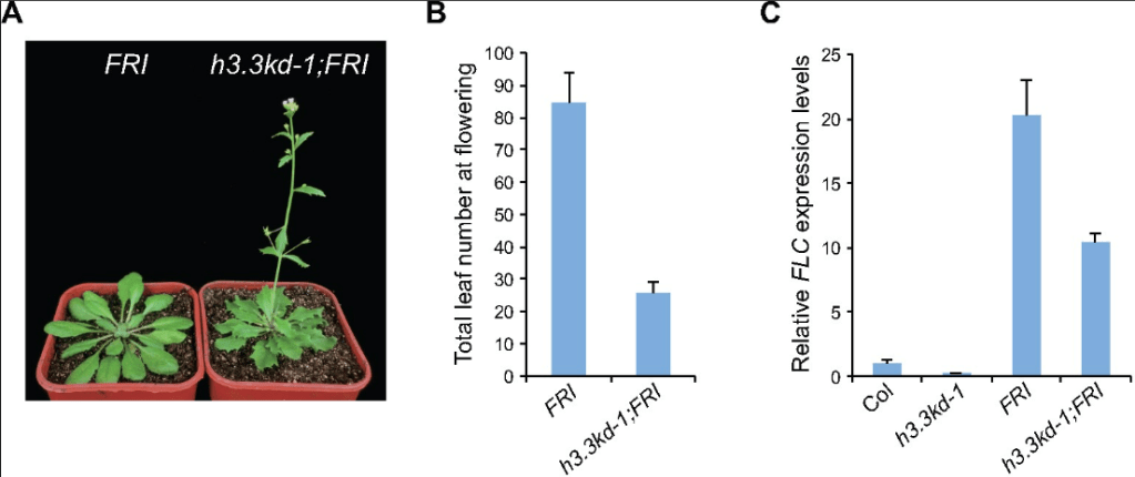 L’expression de FLC est préalablement activée par FRIGIDA (FRI) qui favorise l’insertion du variant d’histone H3.3 dans les séquences régulatrices de FLC ce qui provoque des modifications de la chromatine qui stimulent sa transcription (Zhao et al., 2021).