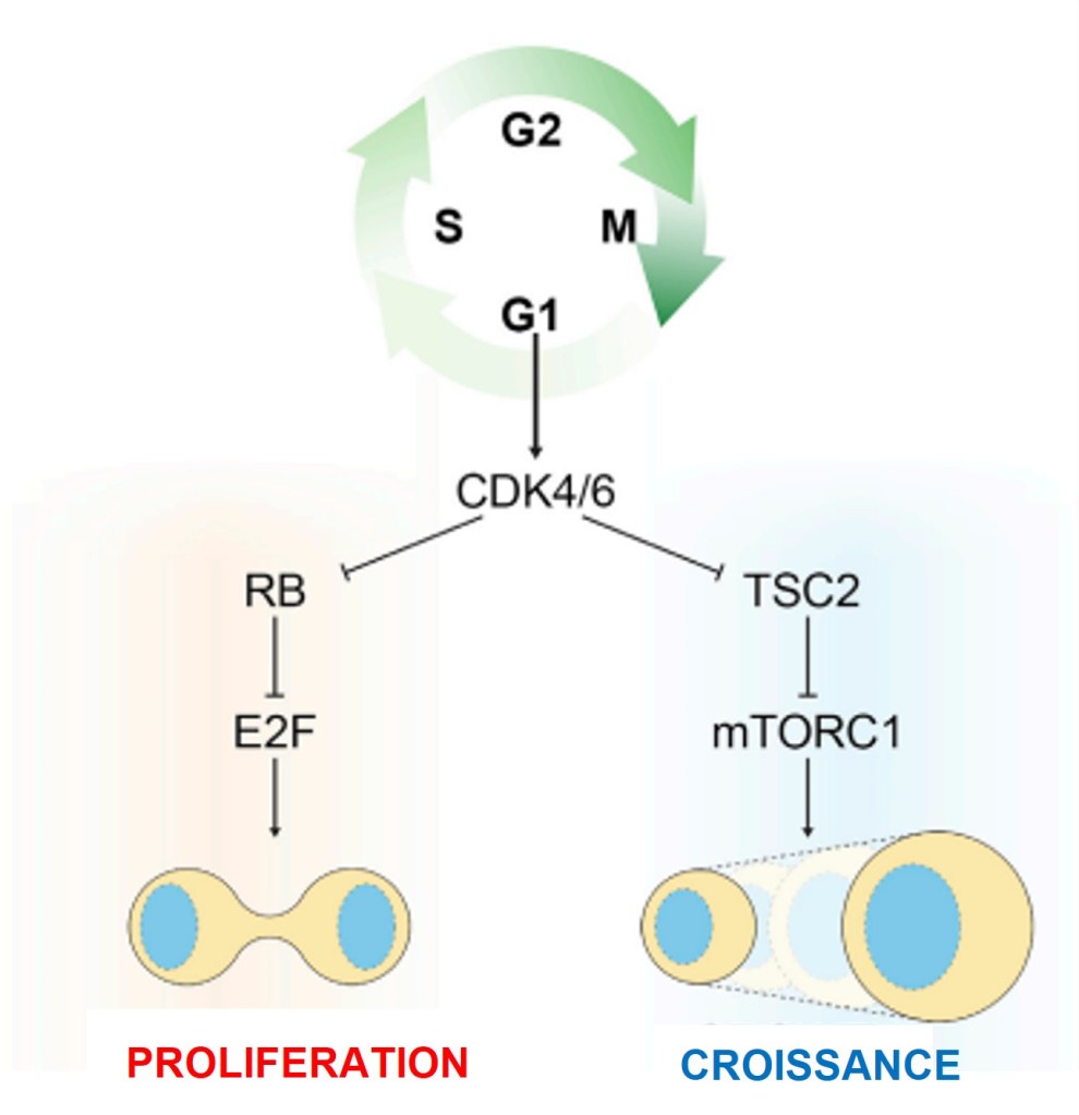 Les complexes cycline D-CDK4/6 et cycline E-CDK2 favorisent la progression dans G1 (Aktas et al., 1997). Ainsi, des niveaux élevés de cycline D ou de cycline E et de CDK4/6 augmentent la prolifération en entraînant le passage à travers la phase G1. A l’inverse, des stimuli qui diminuent l’abondance et l’activité de ces protéines induisent une quiescence (Aktas et al., 1997). CDK4/6 peut aussi agir sur la croissance cellulaire en activant mTORC1, une kinase qui stimule l’anabolisme (production de nouvelles molécules) et inhibe le catabolisme (destruction de molécules). Elle active mTORC1 en inhibant un de ses inhibiteurs, TSC2. CDK4/6 couple ainsi croissance et division cellulaire (Romero-Pozuelo et al., 2020).