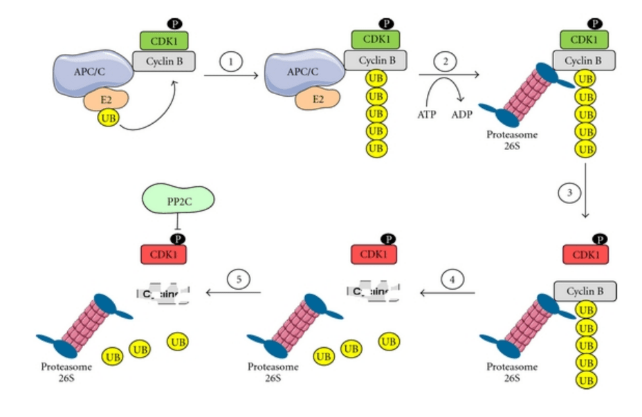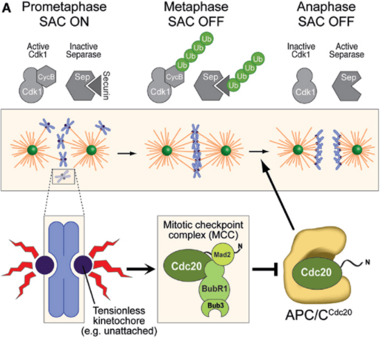 Lorsque tous les chromosomes sont correctement attachés, APC/C provoque la dégradation de la Cycline B comme nous l’avons vu ce qui permet de passer à la terminaison de la mitose via l’anaphase et la télophase.