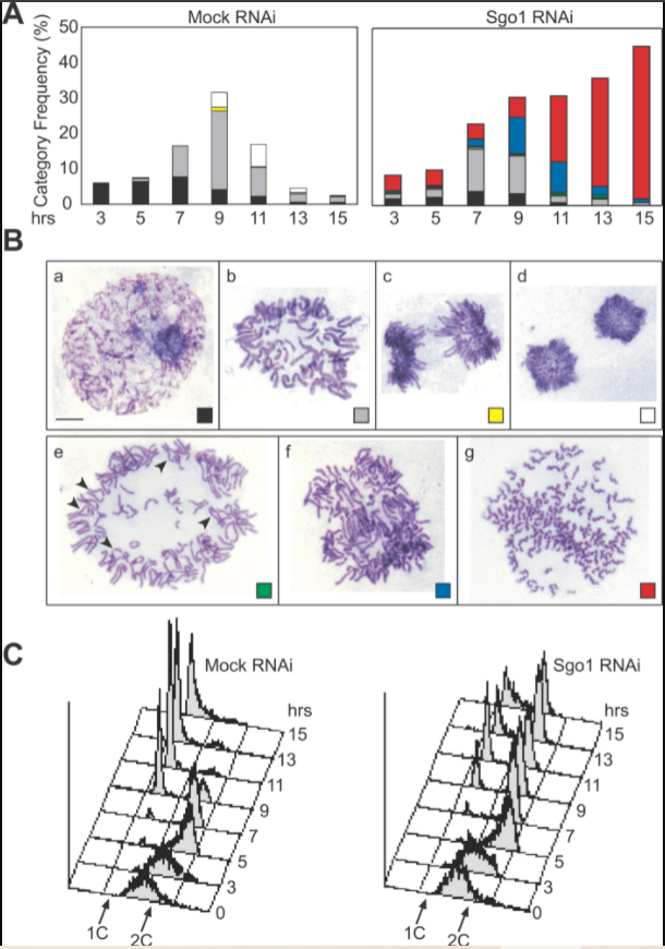 (C) Une partie des cellules récoltées pour l’analyse des figures A et B ont été fixées à l’éthanol et leur contenu en ADN a été analysé par cytométrie de flux (après coloration fluorescente au iodure de propidium). On voit que la mitose est bloquée car le nombre de cellules 2C devient stable au cours du temps quand Sgo1 est déplété par le siARN. Source : https://journals.plos.org/plosbiology/article?id=10.1371/journal.pbio.0030086