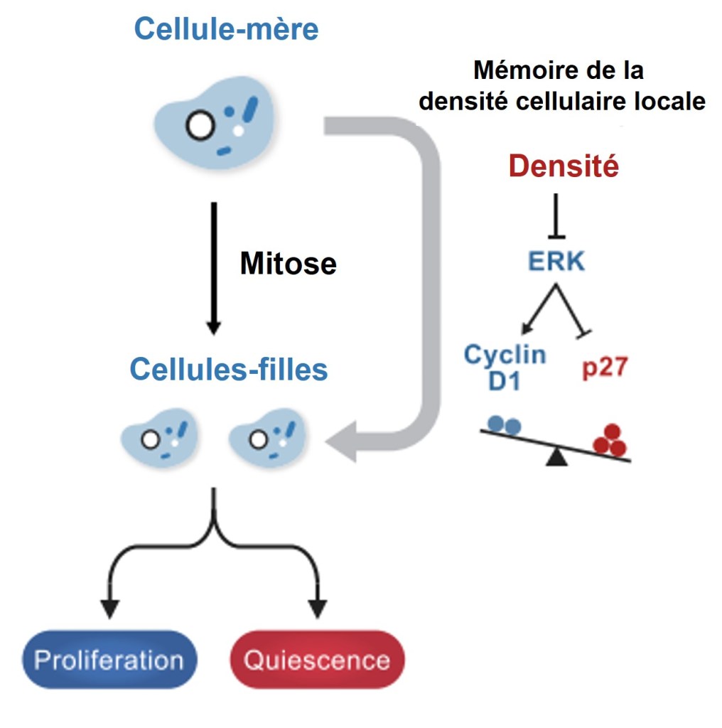 L’équilibre entre la cycline D qui pousse à la prolifération et p27 qui oriente vers la quiescence dépend aussi de la densité cellulaire. Une cellule fille qui vient d’être générée par mitose a « gardé en mémoire » la densité cellulaire où se trouvait sa cellule mère et cela modifie l’activité de ces protéines. C’est une composante de ce que l’on appelle l’inhibition de contact. Une forte densité dans la cellule mère supprime l’activité ERK qui aboutit à un ratio p27/Cycline D augmenté dans la cellule fille (Fan et Meyer, 2021).