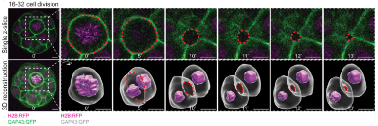 La cytodiérèse correspond au pincement qui se forme entre les deux cellules-filles et qui aboutit à leur séparation. Il est contrôlé par un anneau contractile d’actine/myosine.