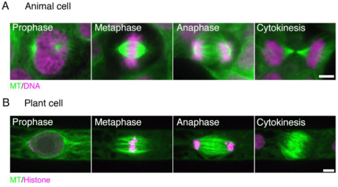 Les végétaux n’ont pas de centrosomes, le centre de nucléation et d’organisation des microtubules que l’on trouve dans les cellules animales. Les fuseaux mitotiques s’organisent malgré cela, mais de manière différente. Le fuseau métaphasique est généralement en forme de tonneau sans un seul point de focalisation à chaque pôle. Dans les derniers stades de la mitose, une cellule végétale assemble un phragmoplaste qui est un réseau de microtubules important pour le dépôt de matériau à la plaque cellulaire où se formera la paroi entre les deux cellules-filles.