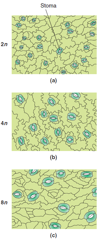 (a) Diploïde ; (b) Tétraploïde ; (c) Octoploïde. On constate que la taille des cellules augmente, particulièrement au niveau des stomates, avec une ploïdie accrue. Source