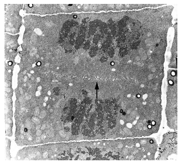 périphérie et démantelés au centre. Des microfilaments d’actine sont également présents et avec les microtubules, ils coordonnent l’intense activité sécrétrice qui permet le dépôt de la nouvelle paroi cellulaire qui va séparer les deux cellules-filles.