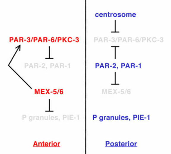 En parallèle de la réorganisation du réseau de microtubules autour du centrosome paternel, le réseau cortical d’actine-myosine contractile se déplace vers le futur embryon antérieur (Munro et al., 2004), accompagné de l’établissement de domaines corticaux mutuellement exclusifs des protéines PAR, avec aPKC-3/PAR-3/PAR-6 du côté antérieur et PAR-1/PAR-2/LGL-1 du côté postérieur (Rose et Gönczy, 2014). L’inhibition réciproque des protéines PAR antérieures et postérieurs est un élément essentiel de la polarisation. PAR-1 est capable de phosphoryler PAR-3 ce qui mène à sa dégradation et la phosphorylation de PAR-2 par aPKC empêche sa bonne localisation.