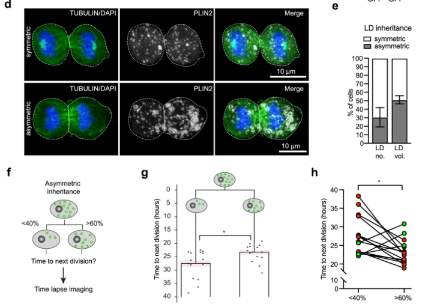 Lors des divisions asymétriques, des organelles et des vésicules peuvent se répartir de manière inégale entre les cellules filles. Par exemple, dans les cellules souches neurales de la zone sous-ventriculaire du cerveau de la souris adulte, les gouttelettes lipidiques peuvent se répartir de manière inégale et la cellule souche neurale fille qui en hérite le plus prolifère plus vite (Ramosaj et al., 2021).