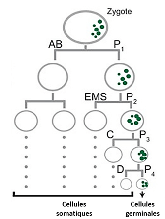 La ségrégation asymétrique des déterminants est également utilisée lors des premiers clivages de l’embryon de C. elegans pour spécifier la lignée germinale et la lignée somatiques. Le zygote subit quatre divisions asymétriques, dont chacune donne naissance à un blastomère somatique plus grand (AB, EMS, C et D) et à un blastomère germinal plus petit (P1, P2, P3 et P4). Au cours de ces divisions, les granules P et les protéines nécessaires au développement de la lignée germinale sont hérités préférentiellement par l’une des 2 cellules-filles. Les granules P sont de gros complexes ribonucléoprotéiques que l’on trouve exclusivement dans la lignée germinale.