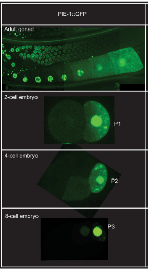L’observation dans le zygote de granules P marqués par fluorescence dans des embryons vivants a révélé que la ségrégation des granules P implique à la fois un mouvement dirigé et une dégradation localisée. Avant le premier clivage, les granules P sont dispersés dans tout le cytoplasme puis migrent vers le pôle postérieur où se formera le blastomère germinatif P1. Les granules P qui restent dans la partie antérieure sont dégradés (ou désassemblés). Le cytosquelette d’actine et plusieurs protéines corticales localisées de manière asymétrique le long de l’axe antéro-postérieur sont nécessaires à la ségrégation des granules P. Un autre facteur qui sépare la lignée germinale dans les embryons précoces est PIE-1, une protéine codée par la mère nécessaire pour inhiber la transcription de certains ARNm et bloquer ainsi le développement somatique dans les blastomères de la lignée germinale. Comme les granules P, la protéine PIE-1 se trouve initialement dans tout le cytoplasme des embryons nouvellement fécondés et s’enrichit dans le cytoplasme postérieur avant le premier clivage. En conséquence, PIE-1 est présent principalement dans P1 au stade 2 cellules. La ségrégation asymétrique de PIE-1 est répétée dans les blastomères germinaux P1, P2 et P3.
