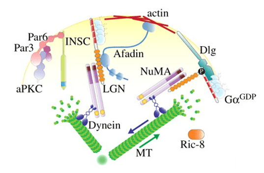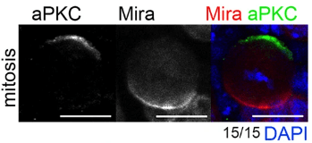 L’autre modèle abondamment étudié pour examiner la distribution asymétrique des déterminants du destin cellulaire est le neuroblaste de la drosophile, le type cellulaire à l’origine du développement du système nerveux central. Les neuroblastes se divisent de manière asymétrique le long d’un axe apical-basal pour produire un grand neuroblaste apical (auto-renouvellement) et une petite cellule mère ganglionnaire du côté basal (GMC). Bazooka (Baz, l’homologue de Par-3) interagit physiquement avec Par-6 et la protéine kinase atypique C (aPKC), formant le complexe Par, localisé sur la membrane cellulaire apicale du neuroblaste mitotique qui établit un repère apical pour la division asymétrique (Wodarz et al., 2000). aPKC phosphoryle Miranda (Mira) et Numb qui ne peuvent plus s’associer à la membrane plasmique du côté apical et qui forment alors un croissant localisé du côté basal (Atwood et al., 2009).