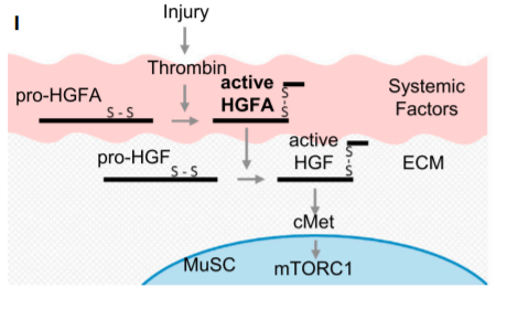 Le HGFA active circule alors dans le sang et catalyse le clivage du pro-HGF en HGF actif dans les tissus de tout le corps. Le pro-HGF était stocké notamment dans la MEC à proximité des cellules souches musculaires (MuSC) appelées aussi cellules satellites. Transformé en HGF actif, il va se lier au récepteur c-Met à la surface de ces cellules et les sortir de leur quiescence et les rendre prêtes à proliférer en cas de besoin. Source : https://www.cell.com/cell-reports/pdf/S2211-1247(17)30427-8.pdf