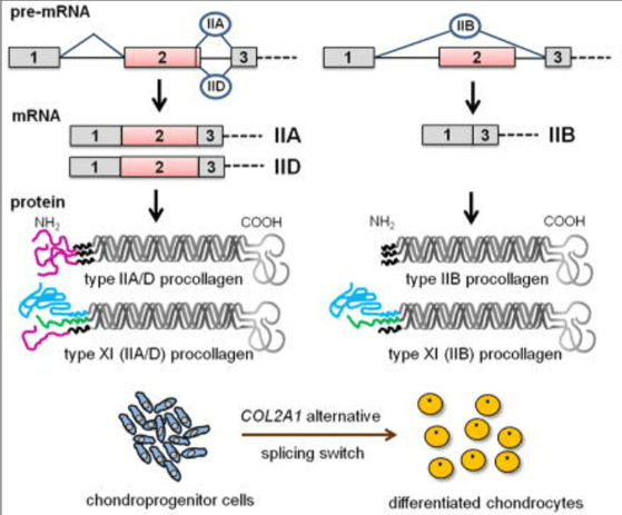 Toutes ces molécules présentent une très grande diversité, d’origine génétique (chez l’Homme il y a 20 chaînes de collagène α différentes) mais aussi grâce à des épissages alternatifs. Il en résulte des isoformes spécifiques des tissus. C’est le cas de la fibronectine dont le pré-ARNm contient 50 exons. Il subit un épissage différent dans les fibroblastes et les hépatocytes. Dans le fibroblaste, l’ARNm contient deux exons de plus que celui produit dans l’hépatocyte. L’isoforme produite par les fibroblastes est sécrétée dans le tissu alentour et permet l’adhérence des cellules à la MEC. L’isoforme générée par les hépatocytes est sécrétée dans le sang et ne favorise pas l’adhérence des cellules. On peut aussi citer l’épissage alternatif du produit du gène COL2A1 qui code plusieurs formes de collagène produits soit dans les chondroblastes (les progéniteurs des chondrocytes), soit dans les chondrocytes différenciés qui forment le cartilage.