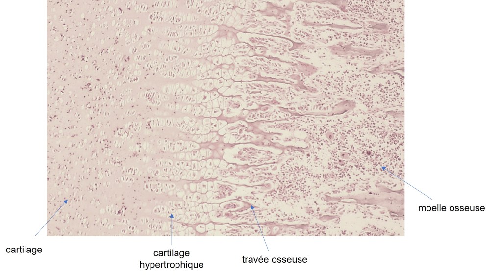 Les tissus osseux peuvent parfois succéder à du tissu cartilagineux. On parle alors d’ossification endochondrale. Elle concerne notamment les os longs des membres et les vertèbres. Lors de la croissance des os longs, c’est la prolifération des chondroblastes dans le cartilage dit de conjugaison qui rallonge l’os. Ces chondroblastes se différencient en chondrocytes et s’entourent d’une matrice extracellulaire riche en collagène II et en GAG. Puis les chondrocytes deviennent hypertrophiques et meurent par apoptose, laissant la place à du tissu osseux. Le taux d’augmentation de taille des chondrocytes hypertrophiques est étroitement corrélé à la vitesse de croissance des différents éléments squelettiques (Cooper et al., 2013).