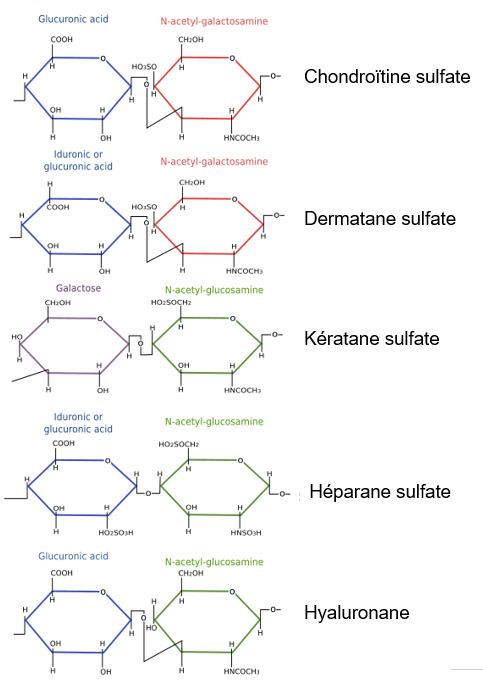 Les glycosaminoglycanes (GAGs) : ce sont de longues chaines d’oses formées par répétition de deux résidus glucidiques (diholoside) : par exemple, acide glucuronique/N-acétylglucosamine.