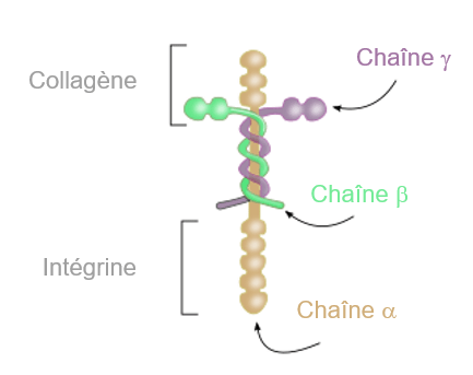 La fibronectine est constituée d’un dimère de grosses chaines polypeptidiques α et β liées par des ponts disulfures. Elle possède des domaines de fixation au collagène, aux sulfates d’héparanes (un glycosaminoglycane, voir plus loin) et aux intégrines (séquence RGD (Arg-Gly-Asp)) qui sont les récepteurs cellulaires à la MEC (voir plus loin). Les souris dépourvues d’allèles fonctionnels de la fibronectine meurent au cours du développement embryonnaire au jour 8,5 après la fécondation (E8,5) en raison de défauts du mésoderme et de la vascularisation (Georges‐Labouesse et al., 1996). Cela souligne l’importance critique de la fibronectine pour le développement embryonnaire à partir de la gastrulation.
