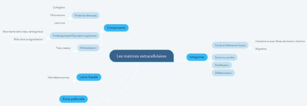 Chez les organismes pluricellulaires, les cellules restent solidaires après la fin de la mitose. Cela est du à l’adhérence cellule-cellule mais aussi à l’adhérence cellule-matrice extracellulaire. La matrice extracellulaire (MEC) est un réseau macromoléculaire tridimensionnel de glycoprotéines qui non seulement permet l’attachement cellulaire, mais aussi agit comme un signal pour les cellules (par ses propriétés mécaniques (mécanotransduction) et par ses propriétés biochimiques). La MEC agit également comme un réservoir d’autres molécules de signalisation (Hynes, 2009). La MEC interagit de manière dynamique avec les cellules pour réguler leur comportement et à leur tour, les cellules réagissent en modifiant la matrice et donc l’environnement local. Il faut donc parler des matrices extracellulaires au pluriel, tant la diversité est importante. Ainsi, les MEC ne constituent pas un simple ciment entre les cellules mais ont des rôles importants pour tous les processus cellulaires.
