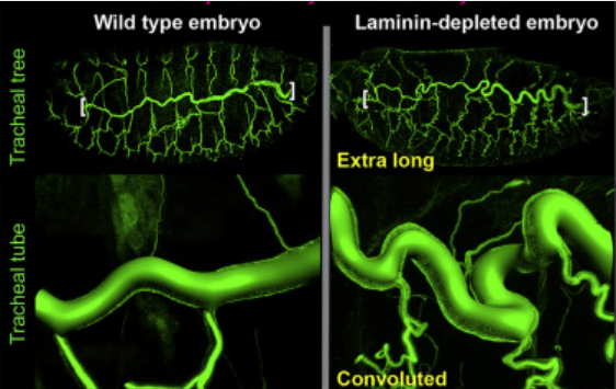 La bonne différenciation des structures épithéliales tubulaires dépend en grande partie de la membrane basale de ces épithélia comme par exemple la formation des trachées chez la drosophile. Leur forme et leur longueur dépend de la présence de la laminine dans leur lame basale (Klussmann-Fricke et al., 2022).