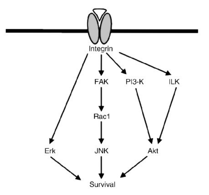 L’interaction des intégrines avec les protéines de la MEC active des voies de signalisation qui favorisent la survie et la progression du cycle cellulaire (Fiore et al., 2018). Par exemple, dans l’épiderme, les cellules souches qui prolifèrent le plus expriment également le plus d’intégrine β1 (Jones et Watt, 1993).
