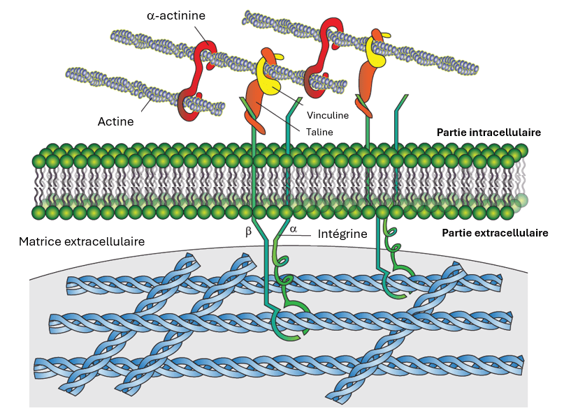 Les intégrines sont des hétérodimères composés de sous-unités α et β. Elles assurent la liaison entre la MEC et le cytosquelette d’actine à l’intérieur de la cellule. La taline (en jaune) relie directement les intégrines au cytosquelette d’actine. Elle joue un rôle crucial dans l’activation des intégrines et la transmission des forces mécaniques. La vinculine (en rouge) recrute d’autres protéines, telles que la paxilline (non représentée ici) , et renforce la liaison entre la taline et l’actine, stabilisant ainsi l’adhésion focale.
