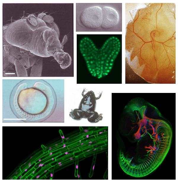 Parmi les vertébrés, la grenouille Xenopus, la souris, la poule, et plus récemment le poisson zèbre, sont maintenant les principaux systèmes modèles étudiés. Parmi les invertébrés, la mouche du vinaigre Drosophile et le ver nématode Caenorhabditis elegans sont très étudiés car on en sait beaucoup sur leur génétique développementale et ils peuvent être facilement génétiquement modifiés.