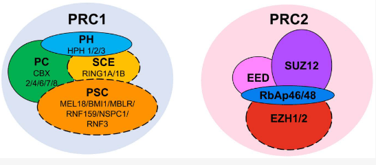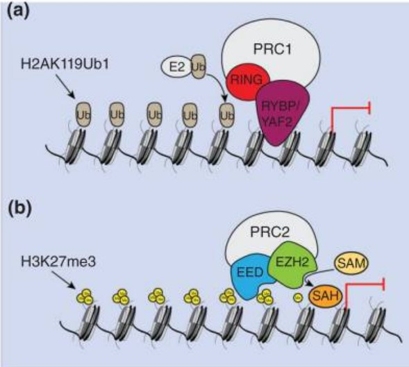 Lin28a agit via la répression du microARN Let-7 qui selon des voies encore inconnues aboutit à ce que les protéines du complexe répresseur de type Polycomb PRC1 ne soient pas aussi présentes sur les séquences régulatrices des gènes Hox, aboutissant à leur expression plus précoce (Sato et al., 2020). Le complexe Polycomb PRC1 et aussi le complexe PRC2 ont également pour rôle de maintenir réprimé à long terme l’expression des gènes Hox « inappropriés » pour une région donnée de l’embryon puis après l’éclosion/la naissance. Le modèle classique d’inhibition de la transcription par les complexes Polycomb implique le recrutement initial de PRC2, qui méthyle triplement H3K27, suivi du recrutement de PRC1 via sa sous-unité de liaison à H3K27me3, conduisant à l’ubiquitylation de H2A qui est une marque épigénétique répressive (Wang et al., 2004).