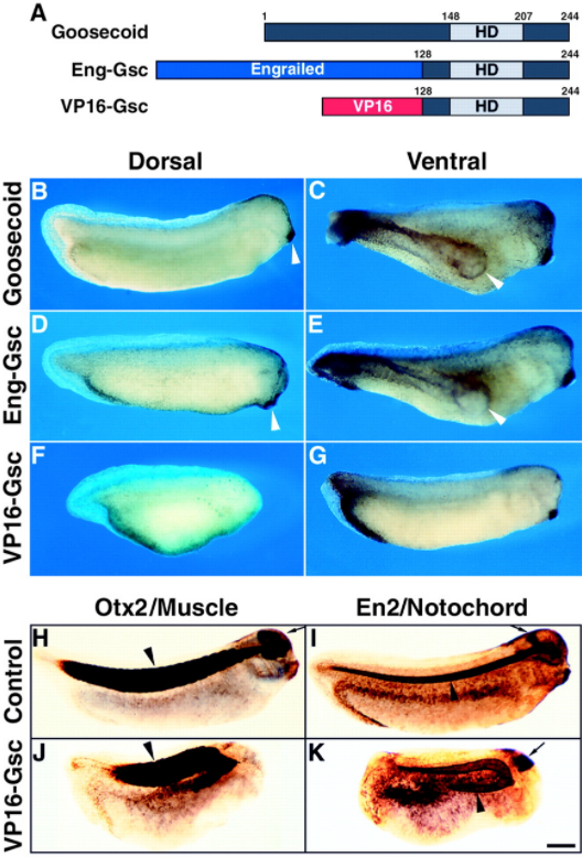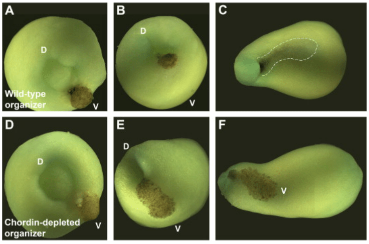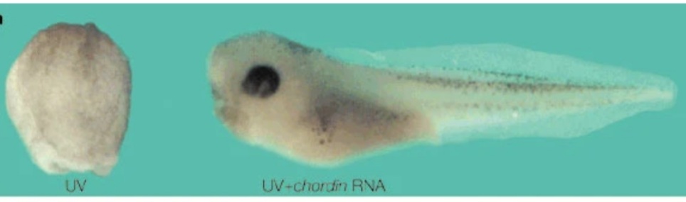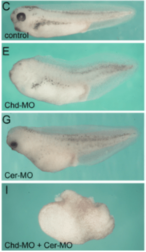 Lorsque l’ARNm de Chordine est injecté dans une cellule ventrale de l’embryon de xénope, il récapitule l’expérience de Spemann et Mangold avec la formation d’un deuxième tube neural, des somites et même une deuxième cavité intestinale (Sasai et al., 1994).