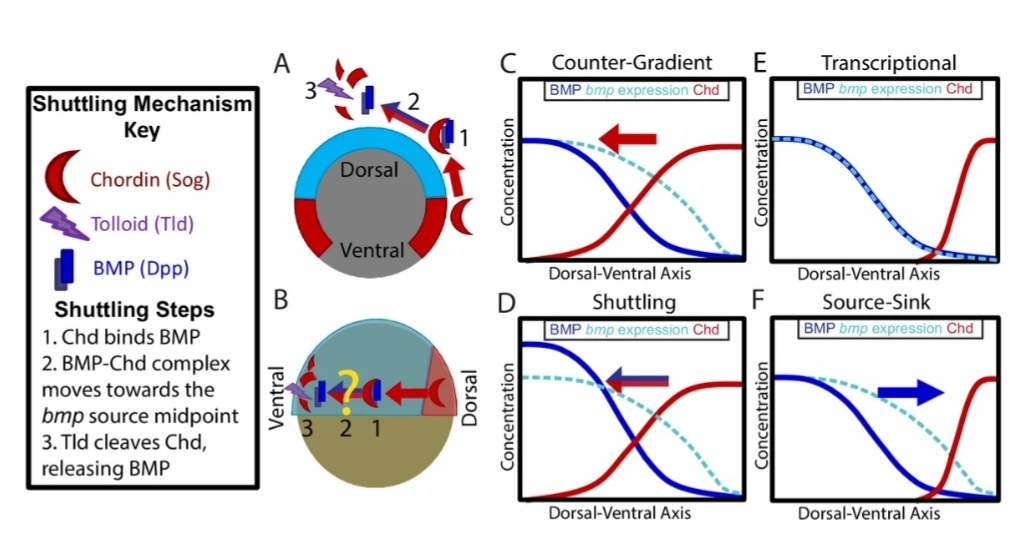 (A) Vue en coupe transversale de l’embryon de drosophile représentant la navette Sog pour Dpp (l’orthologue de BMP chez la drosophile). (B) Vue latérale d’un embryon de vertébré représentant Chordine (Chd) faisant la navette de BMP en direction de la région ventrale. (C) Contre-gradient : Chd diffuse ventralement pour former un contre-gradient réprimant le BMP. (D) Navette: BMP lié à Chd est transporté ventralement, où il est libéré par clivage Tolloid. (E) Transcriptionnel : BMP reste là où il est produit, reflétant le gradient d’expression BMP. (F) Source-puits : BMP diffuse de sa source de production ventrale à un puits de Chd dorsal. Source : https://elifesciences.org/articles/22199