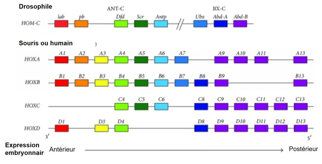 La même règle de colinéarité que chez la drosophile s’applique chez les Vertébrés. Plus le gène est en 5′ dans le complexe, plus son domaine d’expression est postérieur (et son expression activée plus tardivement).
