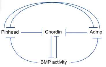 Dans la blastula de poisson zèbre, les membres de la sous-famille BMP, BMP2b, BMP4, BMP7a et Spinhead sont exprimés dans la face ventrale. BMP4 n’est pas nécessaire pour le développement ventral, tandis que les trois autres membres BMP sont essentiels pour un développement correct de l’axe DV. La signalisation de la β-caténine et la signalisation nodale (Ndr1 / Ndr2) agissent ensemble pour activer l’expression des antagonistes à BMP comme chordine et noggin dans la marge dorsale, ce qui empêche les ligands BMP d’agir du côté dorsal. La signalisation FGF réprime l’expression des gènes BMP et augmente l’expression de Chordine et de Noggin. Admp et BMP2b sont également exprimés dans la marge dorsale, neutralisant ainsi les Chordine et Noggin locaux (Xue et al., 2014; Yan et al., 2019). On se retrouve avec un système avec de multiples régulations croisées qui permet d’apporter de la robustesse à cette étape cruciale du développement.