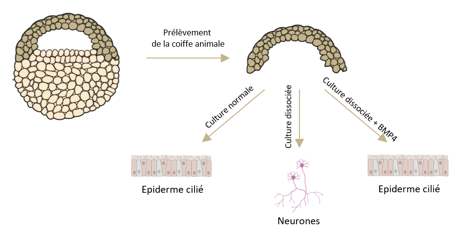 Juste avant la gastrulation, l’activité BMP (qui peut s’observer en étudiant la phosphorylation des transducteurs de sa voie Smad1, Smad5 et Smad8) établit un gradient ventral haut à dorsal bas, et une faible activité BMP sur la face dorsale permet aux cellules ectodermiques d’acquérir un destin neural, tandis que les autres cellules ectodermiques prennent le destin de l’épiderme (Schohl et Fagotto, 2002). Si on prélève une calotte animale et qu’on la cultive isolée on obtient un épiderme cilié. Mais si on dissocie les cellules, on obtient du tissu neural car on aura dilué BMP (signalons que la dissociation cellulaire provoque aussi une activation soutenue de la voie de signalisation MAPK, qui est nécessaire à la différenciation neurale). L’addition de BMP sur ces cellules dissociées permet de former à nouveau de l’épithélium cilié.