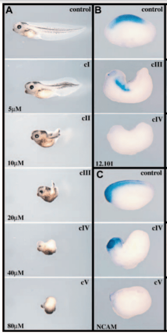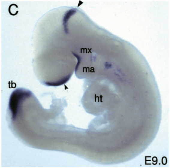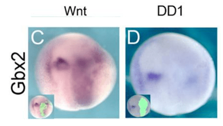 Nous venons de voir que l’inhibition de la voie Wnt était nécessaire pour former la partie antérieure de la tête. Sans cette inhibition, l’expression du gène Otx2 qui marque les structures les plus antérieures du tube neural n’est pas activée.