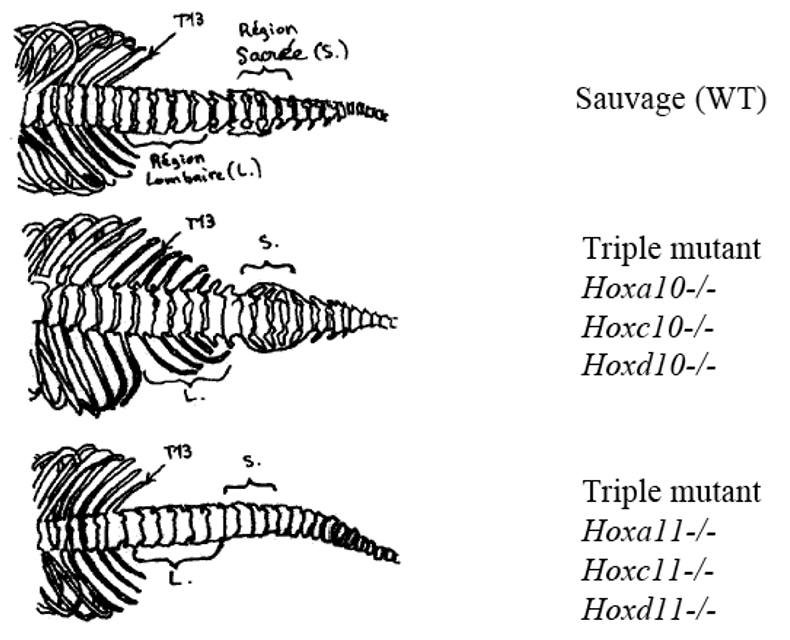 L’action des gènes Hox sur l’identité des vertèbres se passe très tôt. Les vertèbres dérivent du sclérotome en provenance des somites mais la détermination de l’identité des vertèbres a lieu dans le mésoderme pré-somitique, avant même la formation des somites. En effet, si on transplante le mésoderme présomitique qui donne normalement des vertèbres thoraciques dans la région du mésoderme présomitique d’un autre embryon qui donne des vertèbres cervicales, le greffon donnera toujours des vertèbres thoraciques, même dans ce nouvel environnement (Kieny et al., 1972). C’est le signe que la détermination a déjà eu lieu. Comme nous l’avons vus sur des figures sur l’expression des gènes Hox ci-dessus, certains gènes Hox sont exprimés dès la gastrulation, avant même la formation des somites et ils agissent déjà pour régionaliser le mésoderme.