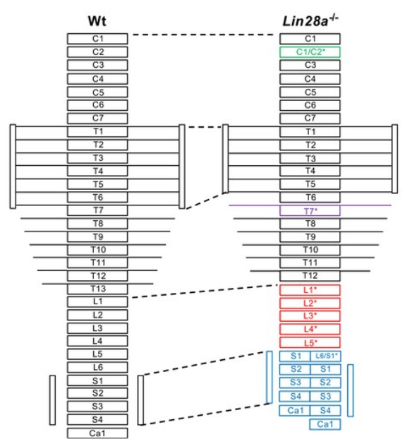 Lin28a est une protéine qui se fixe sur des ARN et qui, notamment, empêche la maturation du microARN Let-7. Chez la souris, Lin28a est nécessaire pour que les gènes Hox postérieurs ne soient pas activés trop tôt. Chez la souris Lin28a-/-, parmi d’autres gènes Hox, le gène Hoxc13 est exprimé trop tôt, ce qui résulte en un arrêt prématuré de la croissance de l’axe AP. L’activation plus précoce d’autres gènes Hox provoquent des postériorisations de vertèbres typiques des gains de fonctions de gènes Hox.