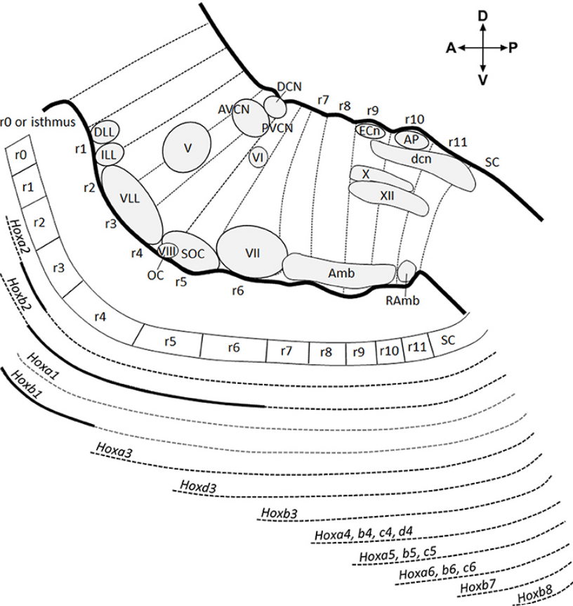Comme chez la drosophile, des gains-de-fonction des gènes Hox postériorisent les structures et les perte-de-fonction les antériorisent. Dans le rhombencéphale, si on élimine toute l’action des gènes Hox en réalisant une perte-de-fonction de Pbx qui est un partenaire essentiel pour que les protéines Hox trouvent leur séquence cible sur l’ADN, tout le rhombencéphale ressemble au rhombomère 1, qui est le rhombomère par défaut (Waskiewicz et al., 2002). La spécification des rhombomères plus postérieurs nécessite le bon fonctionnement des facteurs de transcription Hox.