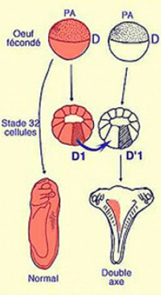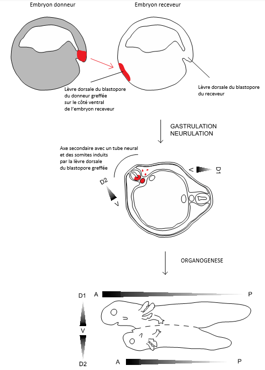 L’expérience de Spemann et Mangold réalisée en 1924 est une des expériences fondatrices de la biologie du développement. Elle consiste en la greffe de la lèvre dorsale du blastopore d’une jeune gastrula d’amphibien sur la région ventrale d’un autre amphibien. On obtient alors un embryon puis une larve qui possède deux axes dorsaux c’est-à-dire deux tubes neuraux, deux cordes, deux séries de somites.