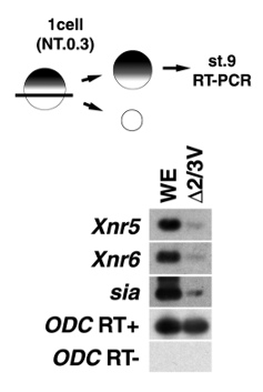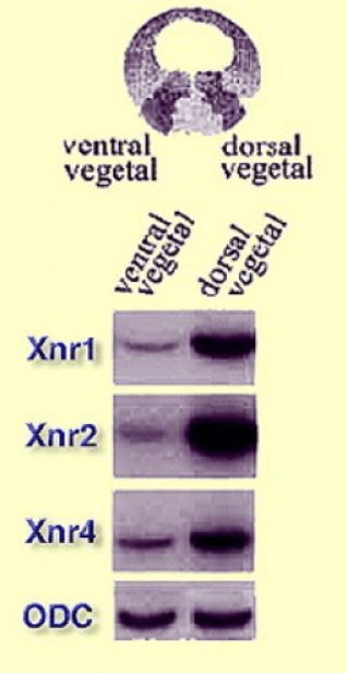 L’expression élevée des Xnr du côté dorsal de l’endoderme est contrôlée par la β-caténine qui œuvre ainsi également dans la formation de l’organisateur de Spemann via l’endoderme alors qu’elle agit déjà plus directement dans le mésoderme dorsal avec l’activation de l’expression de siamois.