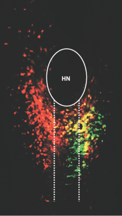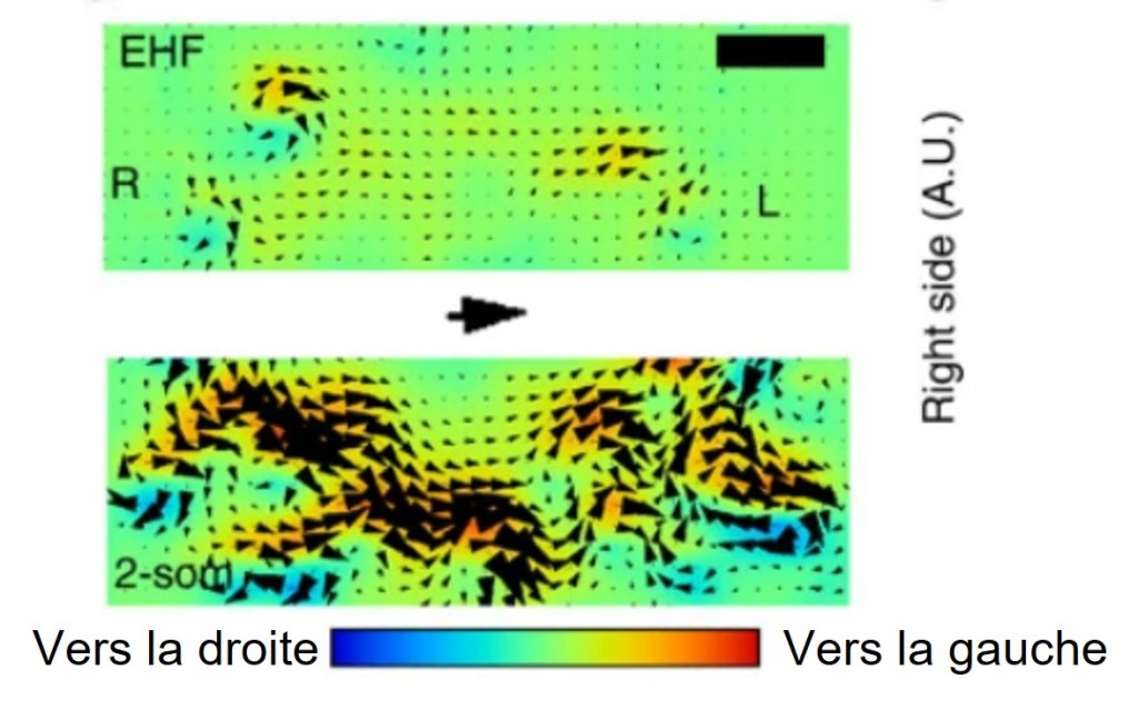 Deux hypothèses principales pour le mécanisme d’action du flux dans la détermination de GD dans l’embryon de souris ont été proposées. Le modèle à deux cils suggère que deux populations de cils nodaux existent dans le nœud de Hensen: les cils mobiles au centre génèrent le flux vers la gauche, tandis que les cils immobiles dans la région périphérique détectent le flux par stimuli mécaniques (Shinohara et al., 2012). L’autre modèle propose que le flux vers la gauche transporte des vésicules submicrométriques (NVP) qui contiennent Sonic hedgehog et de l’acide rétinoïque, qui activent des gènes spécifiques du côté gauche. Quel que soit le mécanisme, il s’ensuit que la voie de signalisation Nodal est activée spécifiquement à gauche. Dans les cellules de ce côté du nœud de Hensen, il y a une entrée de Ca2+ dans le cytoplasme qui active une cascade de transduction aboutissant à l’inhibition de l’inhibiteur de la voie Nodal, Dand5 (aussi appelé Cerl2). Les ARNm de Dand5 sont dégradés plus rapidement sous le l’action de la protéine Bicc1 activée par le Ca2+ (Nakamura et al., 2012, Maerker et al., 2021). La voie de signalisation Nodal peut ainsi agir et activer la transcription de Pitx2 (Yoshioka et al., 1998).