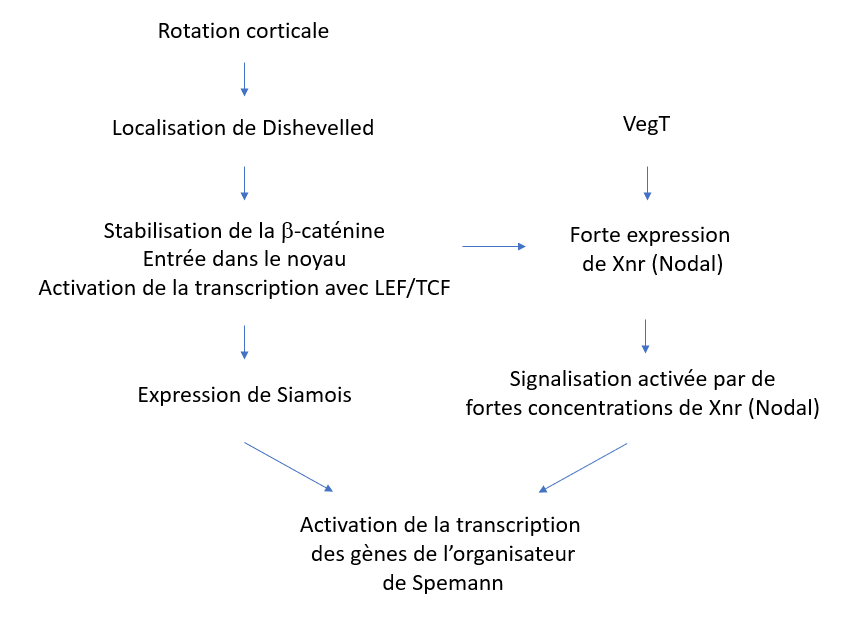 L’expression de Siamois associé avec une activité Nodal élevée (les ligands sont Xnr1/2/4/5/6) sur la face dorsale induit la formation de l’organisateur de Spemann qui est caractérisé par l’expression du gène goosecoid.