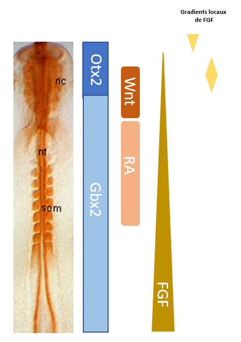 Il existe aussi des gradients locaux de FGF qui organisent les tissus autour mais à une plus petite échelle : paradoxalement tout à l’avant du futur cerveau et aussi à la frontière entre le cerveau moyen (métencéphale) et le cerveau postérieur (rhombencéphale qui est divisé en plusieurs rhombomères dont le premier va former le métencéphale => on parle alors du gradient de FGF à la fontière més-mét (pour mésencéphale-métencéphale) ou dans l’isthme qui est un autre nom pour désigner cette frontière).