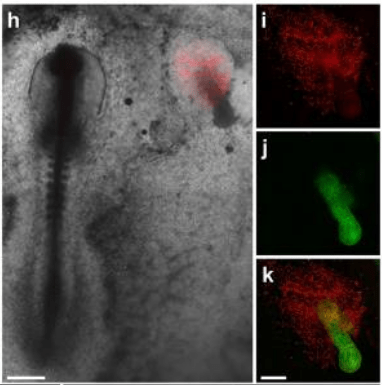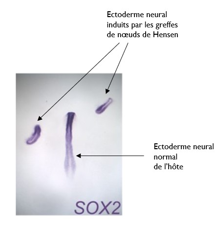 On peut différencier un organisateur de Spemann à partir de cellules souches pluripotentes humaines en présence de Wnt et d’activine. Cet organisateur, greffé sur l’ectoderme d’un embryon de poulet est capable de réaliser une induction neurale, comme l’atteste l’activation de l’expression de Sox2 dans l’épiblaste de poulet adjacent au greffon (Martyn et al., 2018).