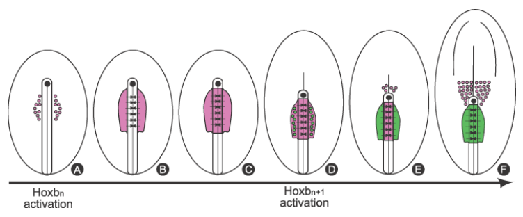 A cela s’ajoute chez les Vertébrés une colinéarité temporelle, plus le gène est en 5′ dans le complexe plus il est exprimé tardivement. Chez la souris, les premiers gènes Hox (en 3′ du complexe) sont exprimés à partir de E7 et les derniers (en 5′ du complexe) sont exprimés à partir de E9. Cette activation séquentielle doit être coordonnée avec la production elle aussi séquentielle de nouvelles structures telles que les somites à partir du mésoderme présomitique (Noordermer et al., 2014).