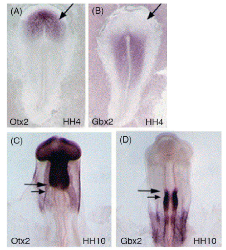 L’activation de la voie Wnt pour former des structures plus postérieures est requise. Notamment, la signalisation Wnt stimule l’expression de Gbx2 qui inhibe l’extension de Otx2 et le cantonne dans les régions les plus antérieures (Li et al., 2009; Inoue et al., 2012).